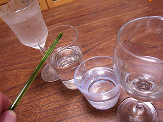 各種グラスに日本酒をぎりぎりまで注ぎます。それをそれぞれある程度まで飲んで減らしていきます。残った分量の違うグラスを叩いて音階を作ります。