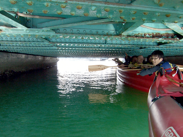この乗り換えたボートですら、ふつうに座っていたら頭がぶつかる。なので、船底に身を横たえるようにして橋に臨んだ。
