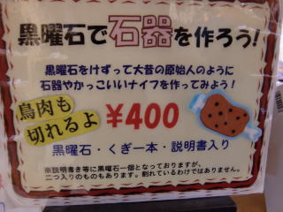 僕は黒曜石の石器セットを買った。「黒曜石をけずって大昔の原始人のように石器やナイフを作ってみよう」というもので、「鶏肉も切れるよ」というキャッチコピーに惹かれた。