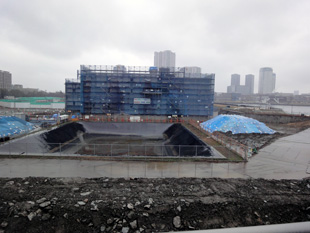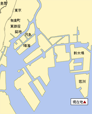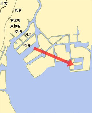 月島の先にある晴海の竣工は1931年。晴海に入るとさすがに埋立地っぽい景色になる。月島は110年で埋め立て地っぽくなかったが、ここはまだ80年なので埋め立て地っぽい。90年ぐらいになにかあるのかもしれない。