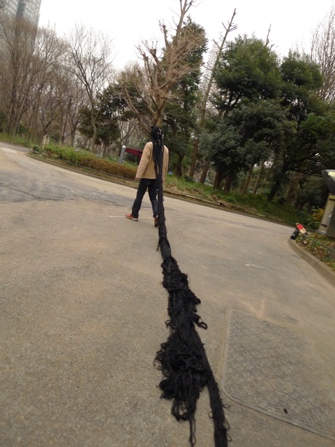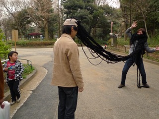 さらに世界一長い髪の大変さを検証するために公園にやってきた。