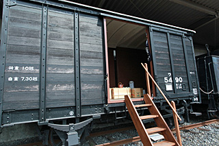 では、いよいよ屋外展示を見に行ってみます。ここも三岐鉄道が場所の提供をした以外はすべてボランティアの手によって運営されていて、展示車両の整備などもボランティアスタッフが行っているとのこと。ちょうど目の前に整備中の貨車があって、痛んだ木製の外板がすべて剥がされ、骨組みがむき出しになっていました。その隣ではタンク車が再塗装中。本当に好きだからできる、好きな人にしか務まらない仕事だと思います。 |