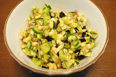 ナス、キュウリ、ミョウガ。ご飯にかけたり、豆腐に乗せたりして食べます。
