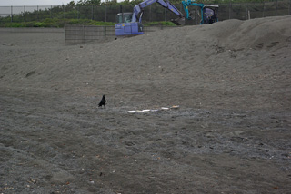 カラスはさんざん悩んだ挙句、結局どれも取らずに飛んでいってしまった。その足ですぐ近くに漂着したミカンをつついていた。