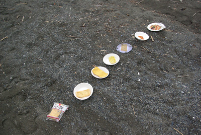 これらダミーの油揚げたちをトンビのいる場所で広げてみた。どのタイミングでトンビは油揚げをさらっていくのか。