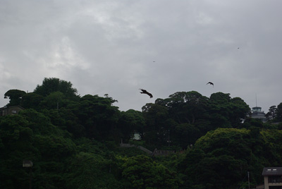 遠目に見ても江ノ島の上空にだけトンビが浮かんでいるのがわかる。なるほど、トンビは観光客を狙うと聞いたことがあるので、江ノ島ならば標的に事欠かないということか。これから僕も行くしな。