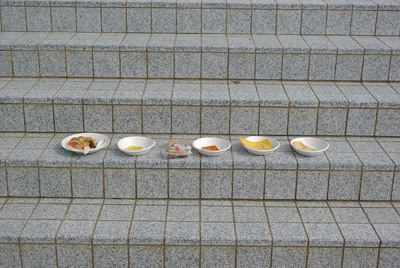 堤防を見下ろす階段にダミーを含む油揚げの皿をセットした。