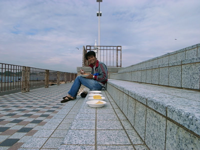 江ノ島はトンビの他にも、カップルや釣り人が多い。そのどちらも興味のあるもの(彼、彼女もしくは魚)にしか目を向けないので、こうやって一人でおかしなことやっている人には無関心なのだ。取材には好都合。