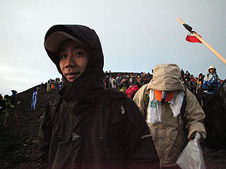 9合目を過ぎたのは8/8の午前2時半。この辺りの事をみんなに聞いても、意識がもうろうとしていてよく覚えてないらしい。もう少しで山頂の鳥居をくぐれる、という時4人とも休憩中に寝てしまった。野垂れ死に寸前だ。