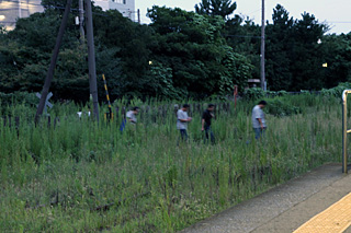 | 草ボーボーの中に踏切があって、そこを渡る人たちがまるであの世の景色だった |