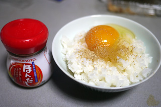 最近、たまごかけご飯も流行っているようで、たまごかけご飯専用の醤油とかも売られているようですが、私からいわせればそんなのアマですよ、プロは“ほんだし”! ちなみにたまごかけご飯のことをTKGと略すのはなんか許せません。
