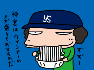 いつもの神宮球場ならば秋にはそこそこ席も空いているので(たいてい消化試合なので)、うどんをすすりながらのんびり野球が観られるのです。…が、今年は勢い余ってヤクルトが首位(10月1日現在)になってしまったため(神宮球場は東京ヤクルトスワローズの本拠地です)、秋になってもけっこう混んでいるもようです。