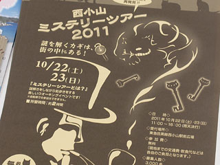 品川区の観光案内所で見つけた「西小山ミステリーツアー」のパンフレット。商店街を謎解きしながら歩くという楽しそうなイベントです。商店街で買い食いしながらビールでも飲みつつ参加したら楽しそうですが、たぶん途中で謎解きなどどうでもよくなってモツ焼き屋にでも入ってしまうのではないかという気もします。