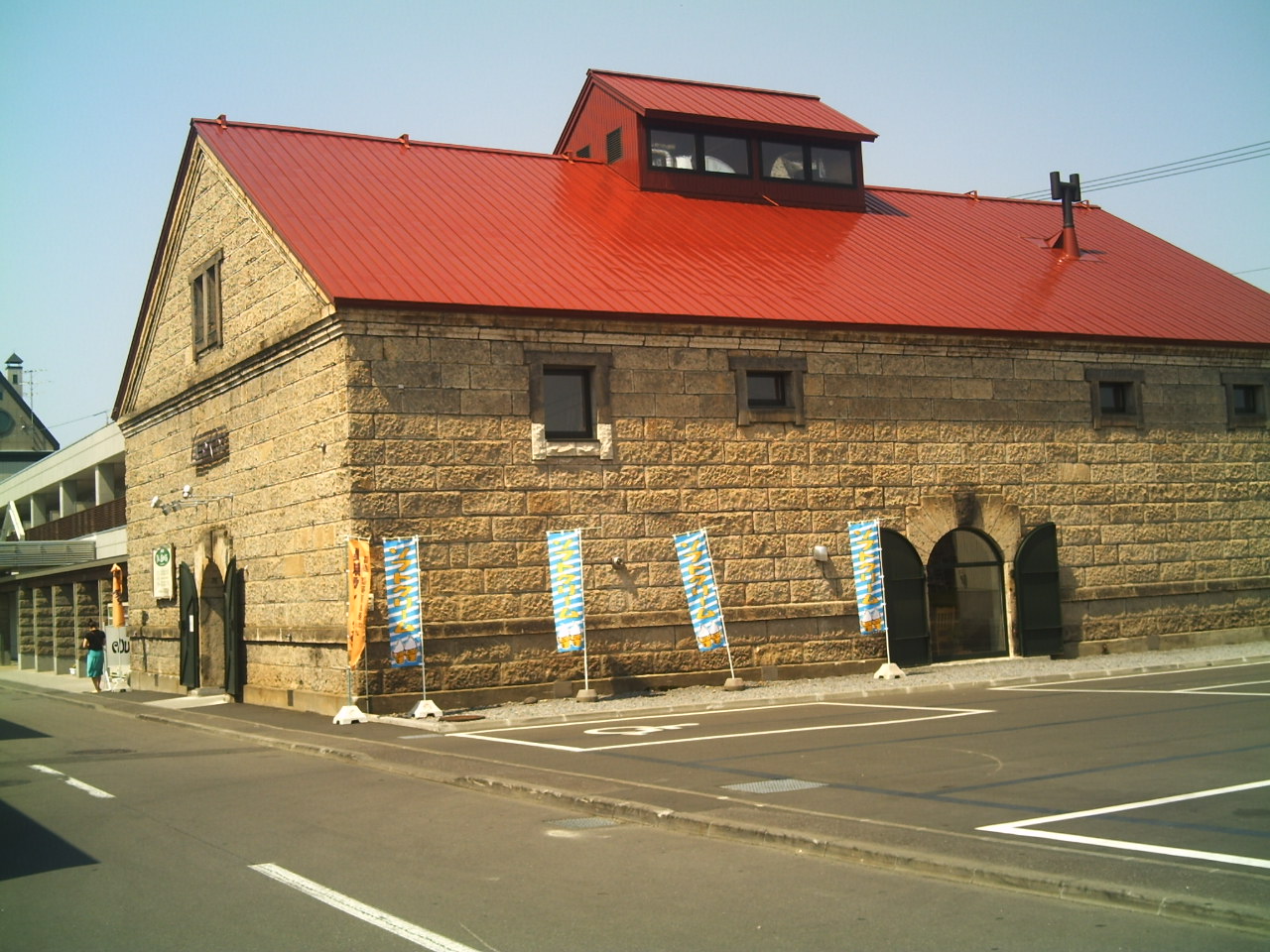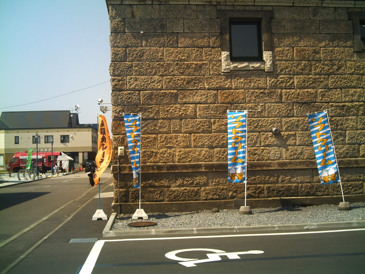 駐車場の横に立っていますソフトクリームの旗の台の下です。