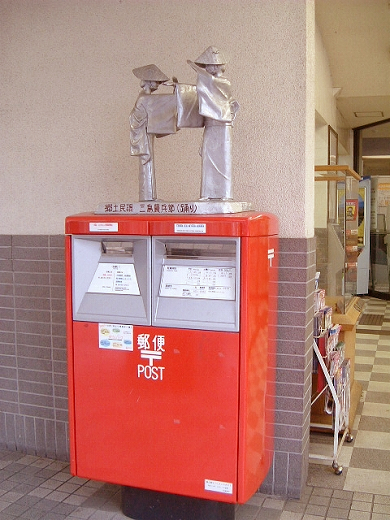JR徳島駅前にある、「阿波踊りの男女のブロンズ像が乗ったポスト」です。
