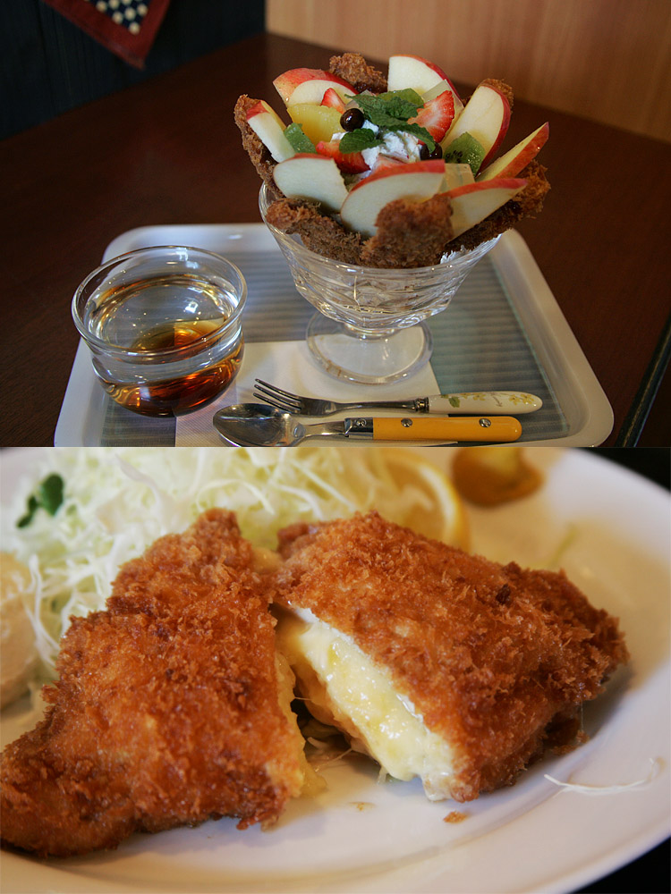上:「とんかつパフェ」 左の容器はフィンガーボールです。 お店のおすすめはとんかつを指で持ってフルーツを乗せてたべるやりかただそうです。