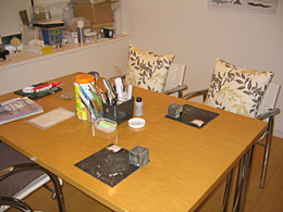 教室に入り、気さくな感じの小早川先生とご挨拶。身につけてらっしゃるネックレスも当然自作のものだそうだ。