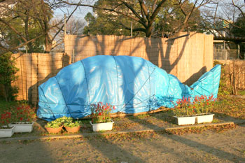 シルエットは、どう見ても魚です。ブルーシートの青さで、より一層魚感が出ています。しかし、唐突にこのサイズの魚オブジェ、こんなところで何をやっているのでしょうか。