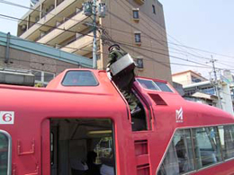 名鉄電車では鈍行でもパノラマカーに乗ることが出来る。パノラマカーというのは車両の先頭部分がガラス張りになっていて、まさに180度のパノラマ風景を見渡すことのできる電車だ。以前は追加料金の必要な区間でしか乗ることができなかったのだが、今では鈍行までもがパノラマカーなのだという。半信半疑のままホームで待つ僕達の前に、なにやら銀色の部分の多い電車が入ってきた。もしかしてあれなのか!