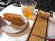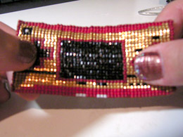 織り機に糸をセットし、設計図を見ながら針にビーズを通していく。設計図作りもドット絵を描いてるようで楽しいが、1段ずつ横糸が積み重なっていくのも楽しい。楽しいのでビールも飲みたくなるってもんだ。