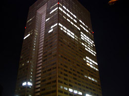 でも上のほうのフロアの人はずいぶん残っている。あの部分が「♪ひかーるーひかる東芝」担当の部署で、電気が消えているフロアは「♪まわーるーまわる東芝」担当かもしれない。