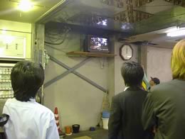 駐車場のテレビで道頓堀の中継を見る道頓堀の人々。