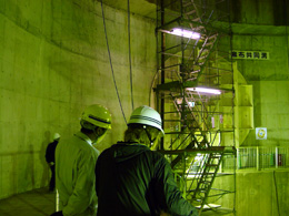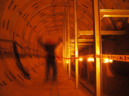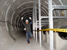地底30mの地点から共同溝に入る。この共同溝は水道、NTT、東京電力で使用されるという。いまあなたが読んでいるこのページも共同溝のなかのケーブルを通って届いているのかもしれない。