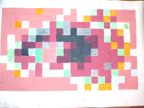 模造紙の方眼の一マスを、そのまま拡大した目の画像の一つのドットとして絵の具で色を塗る。