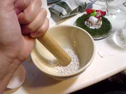 あまり大きいとすぐ沈むだろうから、細かく細かく。でも粉状だとドーム内にスモッグ発生となるので、茶漉しでこしたうえに、水を注いで上澄みをすてるという、飯炊きと同じような手順を踏む。