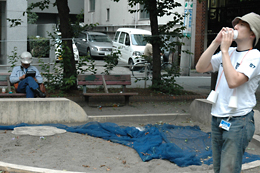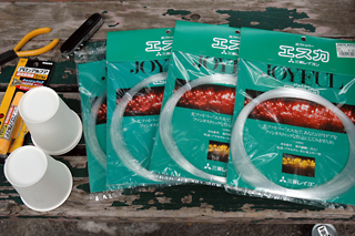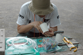 紙コップの底に穴をあけ光ファイバーを通し、あっという間に作業は終わった。 コップに通した光ファイバーは口径1ミリで長さ30メートルのもの。ちょうどBBフェスタの会場で許された長さである。