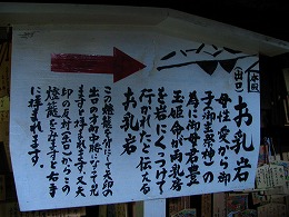 乳岩に向かっていく途中で見かけた案内板の絵も、こちらの気持ちをわかってくれている感じだ。太い毛筆風の書体で乳岩、イラストの抽象度もほどよい。