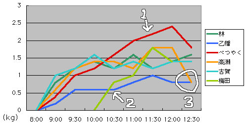 全員、スタートダッシュで1キロ前後増えるとだいたいあとは横這いだというのが分かるが、見るとイレギュラーな見所が何点かあるようだ。 チェックの1番。ひとり気をはくべつやくさんが2キロ越えをマーク。2番、遅れて登場した梅田さんの急激な追い込みぶりがすごい。3番では人よりも緩やかに体重を増やす乙幡さんが豪快に体重を増やした高瀬さんと結局は同じ増加量でフィニッシュしている。 これだけ見ると全体的に不思議だ。グラフを踏まえ、飲食の全記録を見ていくことにしたい。 8:30〜9:30の入出力 全員空腹だったため、スタートダッシュはひじょうにアッパーなものとなった。 ビールで乾杯の前に、林さんはさきに二日酔い防止のタウリンを投入。厳正な記録のためこの100gももちろん飲食の記録に入れた。 以下、INPUT欄には飲食量のグラム数、OUTPUT欄にはトイレ前後の体重の差異を書きました。自分のデータマンぶりに軽く驚きつつ、じっくり見てまいりまっしょい。 |