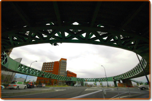 まずはL字型にまたぐパターン。大振りではあるが、なかなか品のある歩道橋だ。