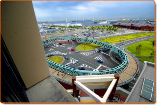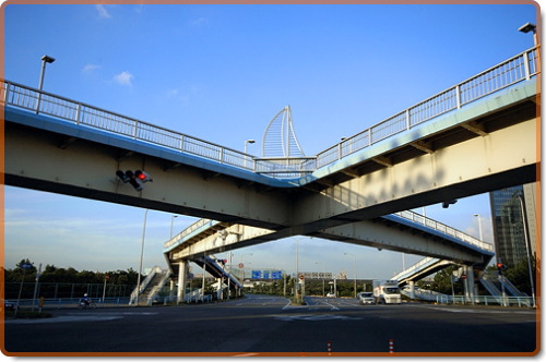上2つのいかにも歩道橋らしい歩道橋の見所ポイントは、渡りたい経路によっては非常に大回りをしなければならない、という歩行者に対する不親切設計にある。