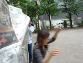 それにしても、破る行為自体は派手なものだが、公園での作業は地味そのものだった。破いてはその紙を物干しから外し、次の紙を装着する。 吉田さんと上符さんは各作業、非常に手際よくぬかりなく進めてくださり、むしろ私がわたわたしてしまっていた。 「あ、風来るぞ、一旦畳もう!」 「風がやんだスキをみて破りましょう」 「紙、セロテープで固定したら、2,3回物干しに巻き込んで強度を高めた方がいいな」 物干し竿に紙を固定させる世界ランキングがあったら、1位と2位をこの二人が独占することは間違いない。 |