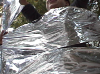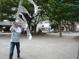 ……はっ! しまった! オマケのつもりでやってみたホイルとラップが今回の企画を何だか余計わけの分からないものにしてしまっていないか。 マンガみたいに突き破るのは、素材としては紙が一番です。身を以て体験して、自信を持ってお勧めします。 野外活動が心地良い、秋の季節。フリスビーやキャッチボールもいいけど、こんなリクリエーションもあるよ、というご提案でした。 |