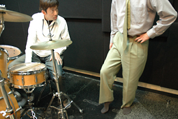 吉澤さんに励まされ、いよいよドラムセットの前に腰掛ける。目の前に並ぶいろんな太鼓とシンバル。それぞれ役割があるのだろうが、生まれて初めてドラムセットの前に座った僕にはその違いが分からない。