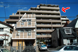たとえば左のマンション。片方から見ると3階建てのように見える。脇の階段を下りて反対側から見ると8階建てなのだ。