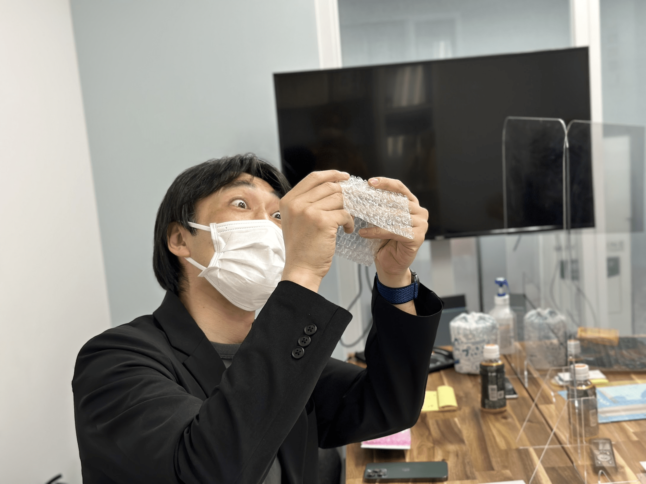 きょうはプチプチの取材。鳴らす専用のプチプチという商品があり、音が大きく気持ち良い。