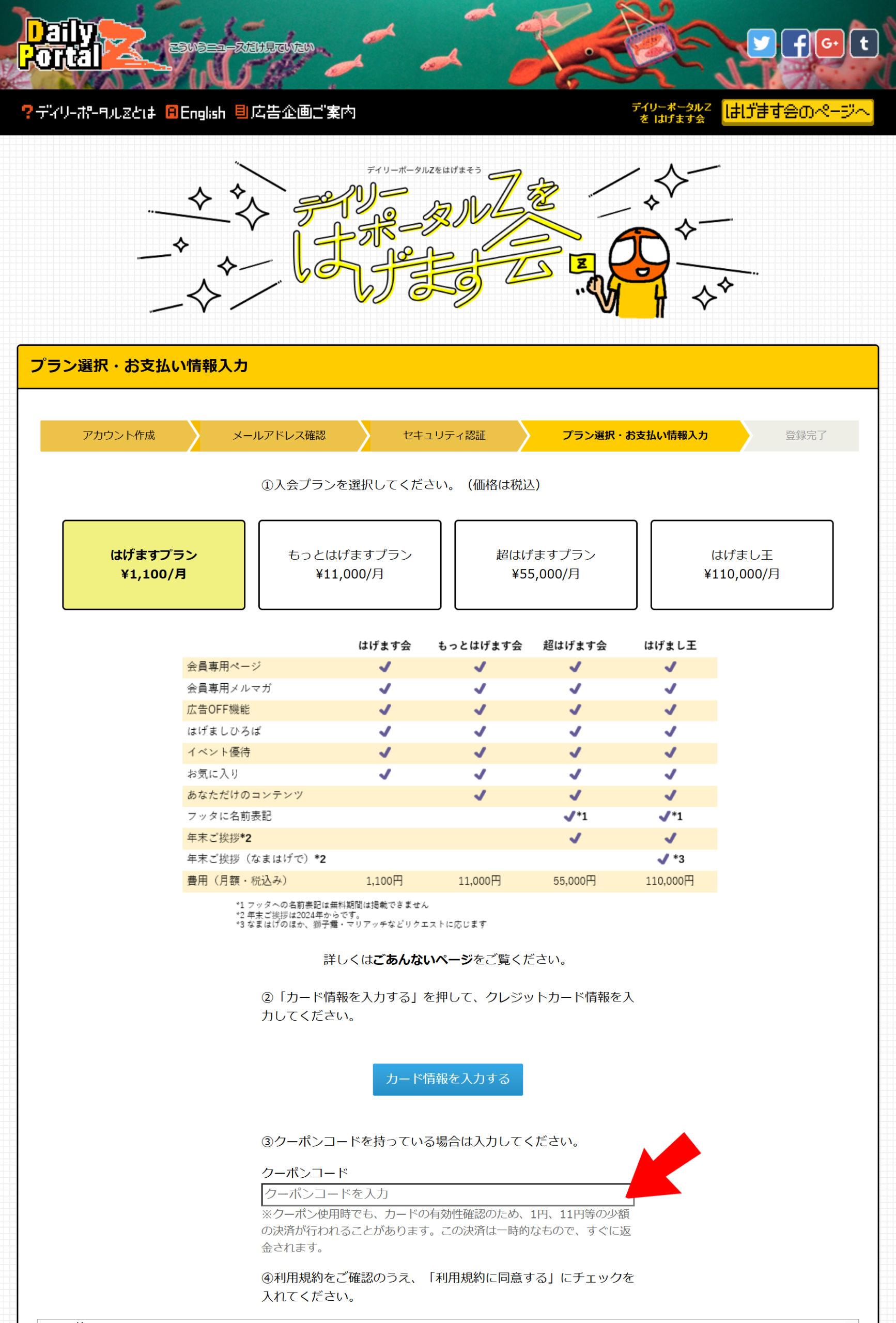入会の手続きをはじめて「あれ?クーポンコード入れるの忘れた?」と一瞬思うほど先にあります。