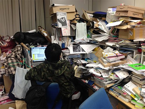 2枚めは乙幡さんの自宅。以前、知人のごちゃごちゃのデスクの写真をFacebookにアップしたらいいねがたくさんついて、その年の一番人気に選ばれてました。みんな汚いデスクが大好き!