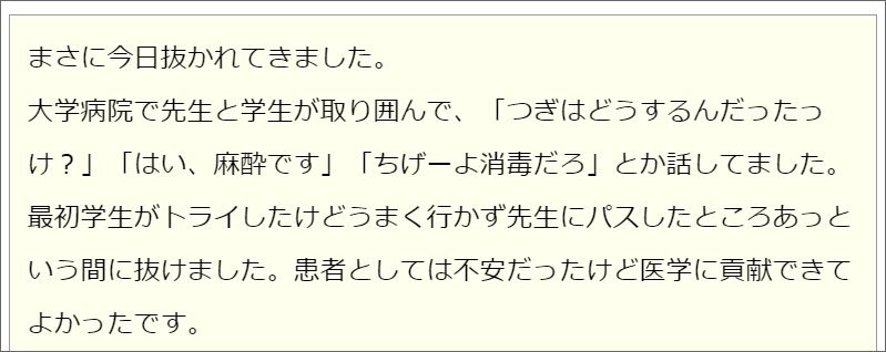親知らずを抜いた人はその体験を人に言いたくなる。人に言うことまで含めて親知らずである。親知らずはコンテンツでした。
