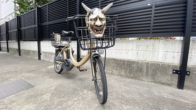 般若がついて光る自転車に乗ってる男。
