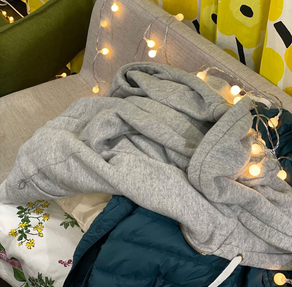 椅子のうえの脱いだ服の上にイルミネーションを掛けてみました。これは意外にありじゃないですか?