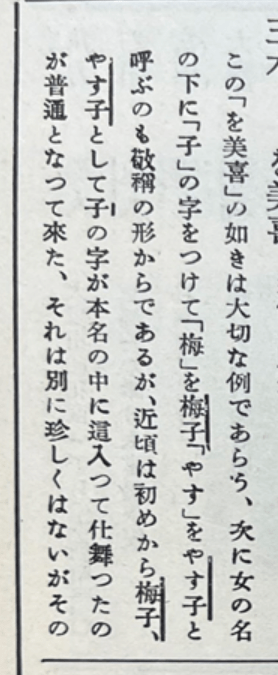 女の名の下に「子」の字をつけて「梅」を梅子、「やす」を靖子と呼ぶのも敬称の形からであるが、近頃は初めから梅子、やす子として子の字が本名のなかに入ってしまったのが普通となってきた。