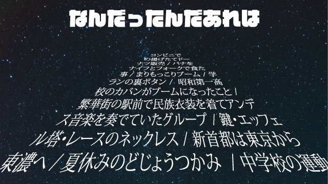 コンビニでの揚げたてドーナツ販売、まりもっこりブーム、昭和第一高校のカバン、繁華街の駅前で民族衣装を着てアンデス音楽を奏でていたグループ、夏休みのどじょうつかみ…