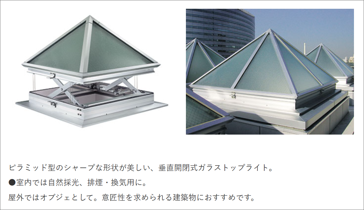 調べてみるとこのように地下に光を取り入れるための窓は「トップライト」 と呼ばれているようです。メーカーのカタログにはピラミッド型のものも掲載されています。