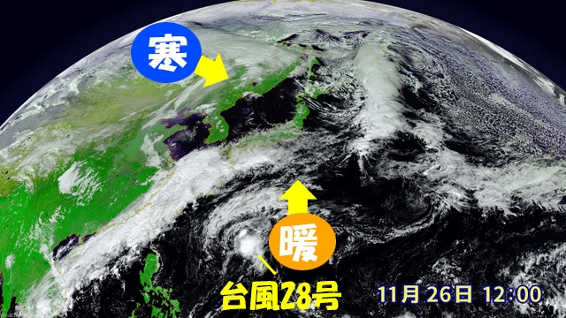 一方で、南海上には、台風28号がグアムあたりから引き連れてきた暖気。台風じたいは次第に弱まるものの、暖気が列島に流れ込めば、暖かさがつづく。