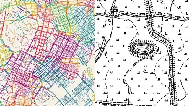 道路の方角は、隣り合う街どうしで微妙に違っていたりする。それが分かりやすいように道を方角によって塗り分けてみたところ、街の地形や歴史が見えて面白かった。