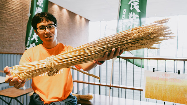 麦稈ロールは麦を刈り取った後の麦わらで作られる。今回の麦稈ロールは小麦で、小麦の収穫はコンバインで穂先だけを刈り取るので、それ以外は畑に残ることになる。それを丸めてロールにしたものが麦稈ロールだ。
